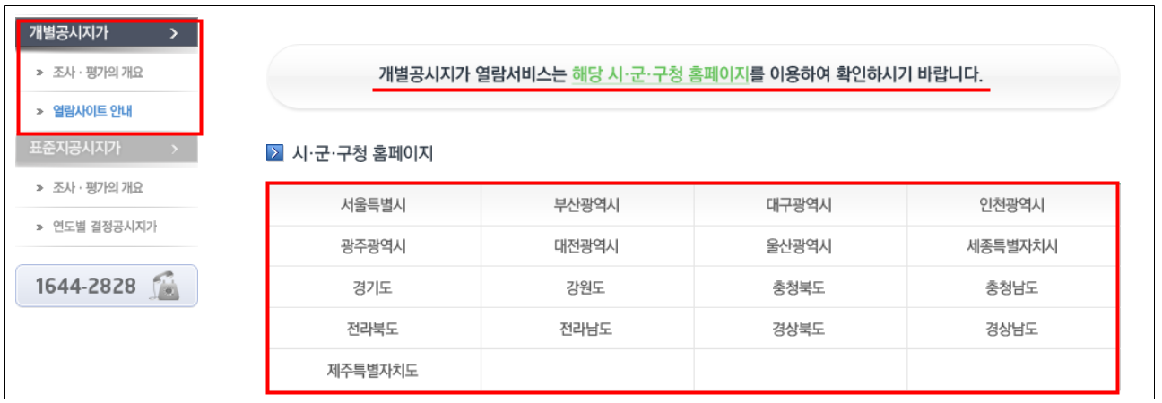개별공시지가 확인 시군구청 홈페이지 바로가기 페이지