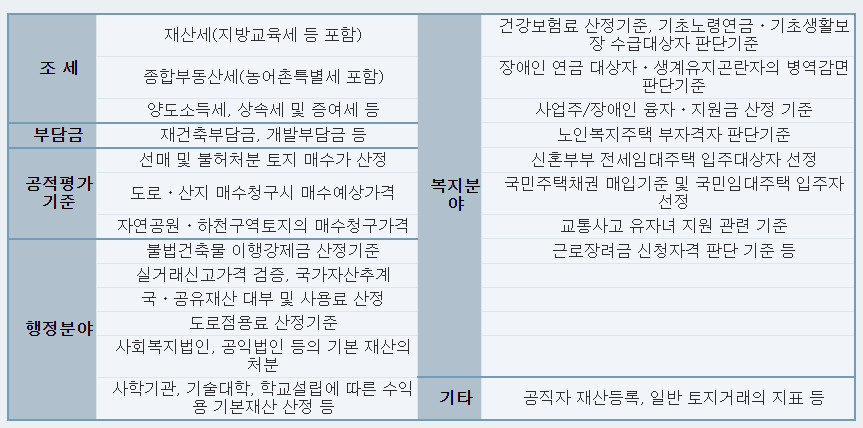 개발부담금 등의 부담금 부과기준이 되며 그외 구체적 활용 현황은 아래와 같습니다.