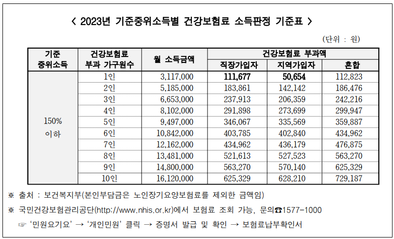 신청인이 속한 가구의 건강보험료 부과액 23년 2월~4월 평균액이 23년 기준중위소득 150%의 건강보험료 부과액을 충족해야 합니다.