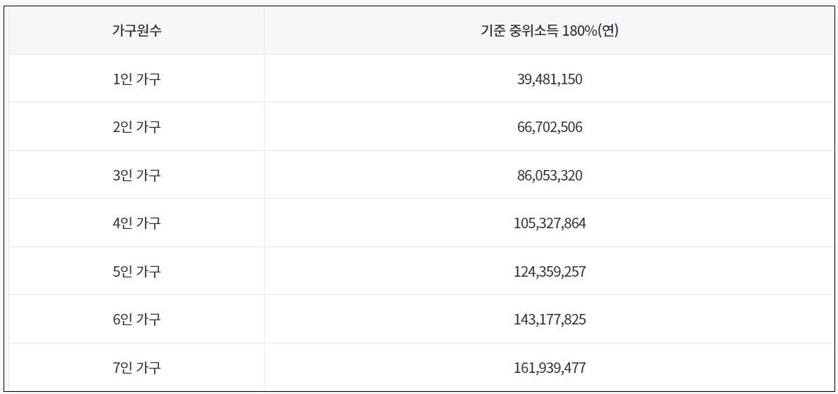 가입 신청자 본인을 포함한 가구원 소득의 합이 보건복지부에서 고시하는 기준중위소득의 180% 이하를 충족하는 분들입니다.