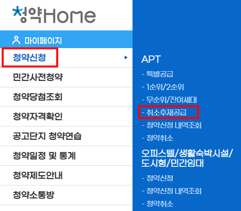 청약홈의 청약신청 > APT > 취소후재공급 메뉴에서 청약 신청이 가능합니다.