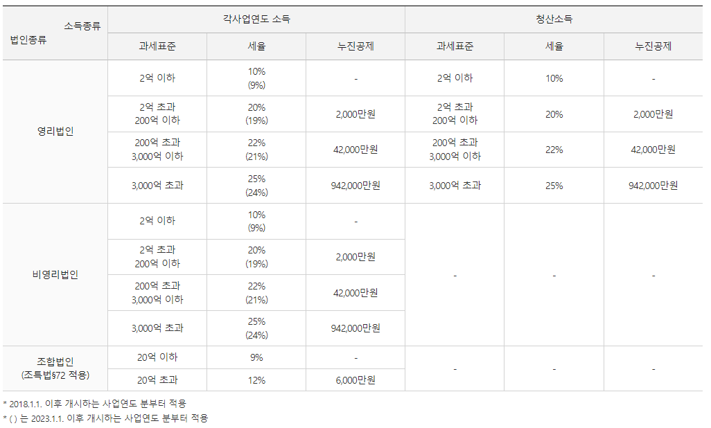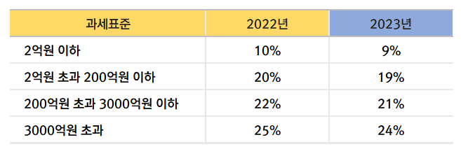 2023년 법인세율이 과세표준 전 구간에서 2022년보다 1%포인트씩 낮아졌습니다.
