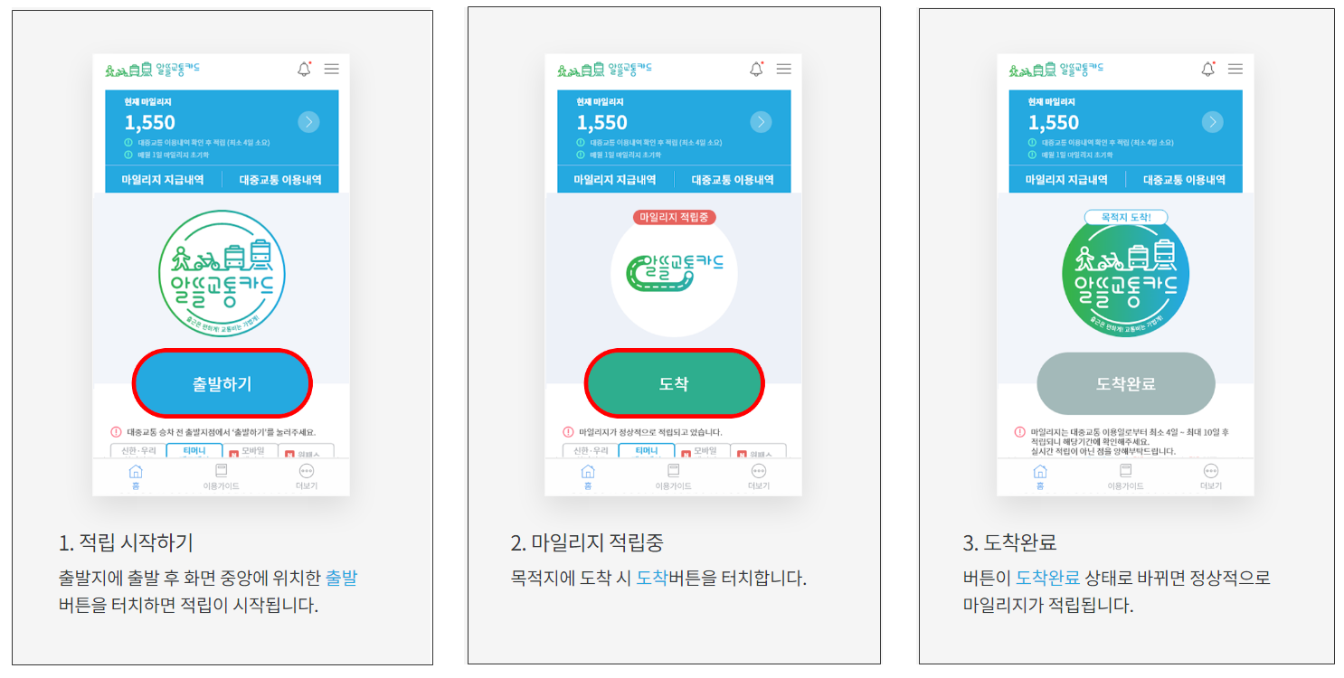 알뜰교통카드는 대중교통 이용자가 정류장까지 걷거나 자전거로 이동하면, 그 거리에 비례해 마일리지를 적립해 주는 공공 교통카드입니다.